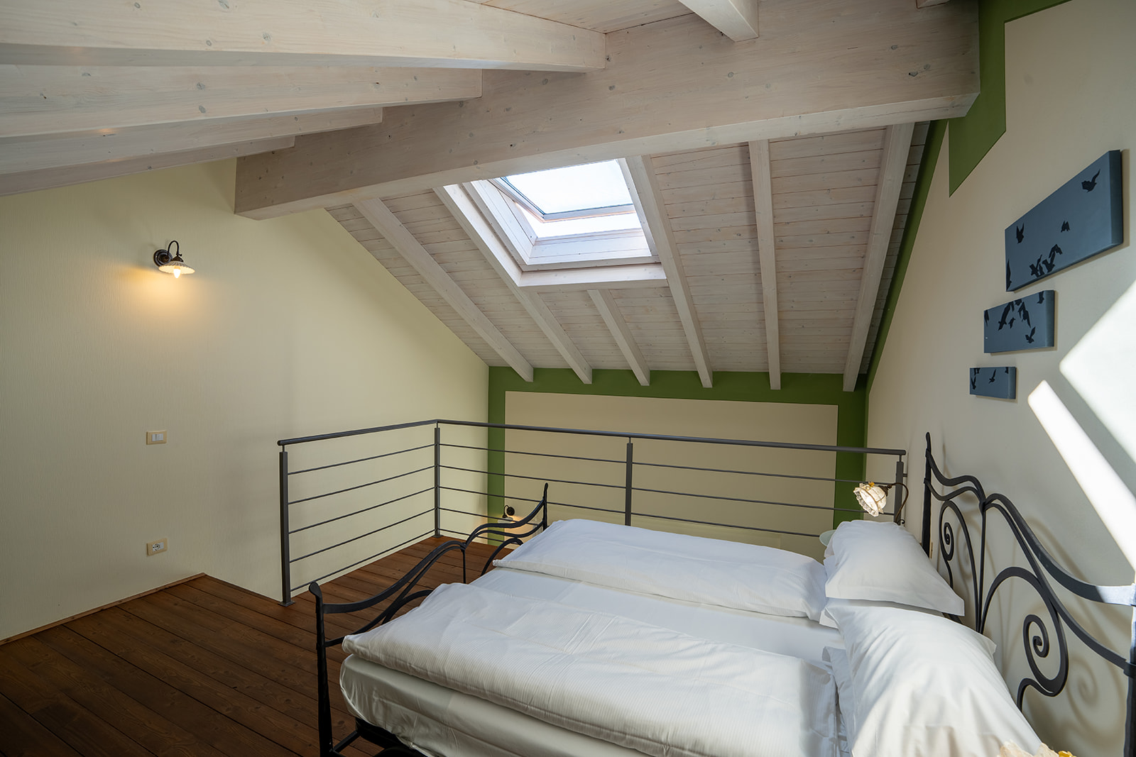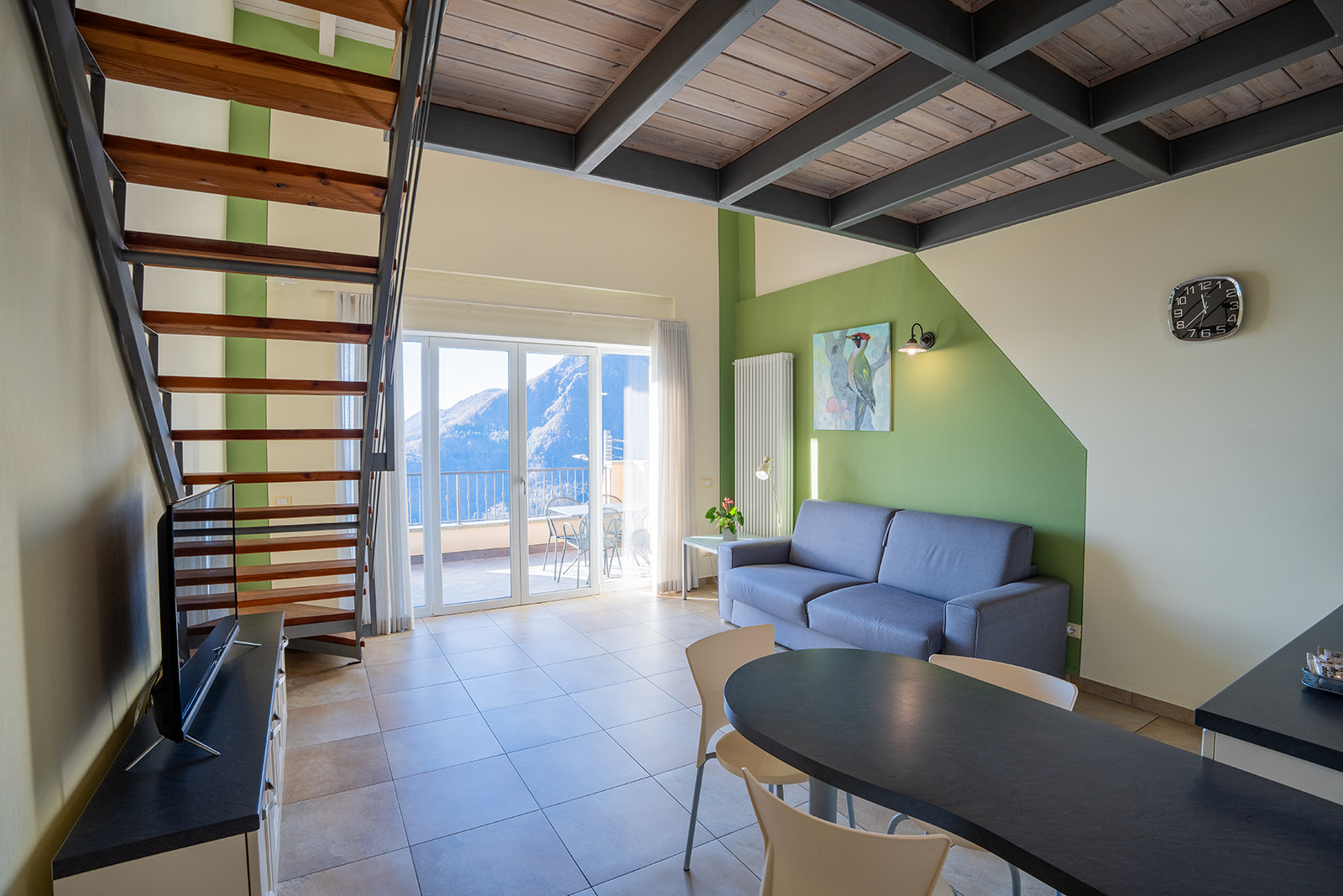 Appartamento su due livelli perfetto per famiglie, con camera separata, zona giorno con angolo cottura e un’area notte su soppalco o secondo livello pensata per i bambini. La terrazza panoramica offre spazi esterni per pranzi e relax, mentre i servizi comuni (lavanderia, parco giochi, parcheggio) rendono il soggiorno comodo e pratico per tutta la famiglia.